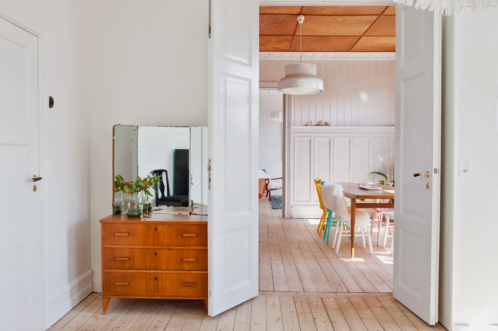 Today I thought I'd share a home here in Malmö, Sweden. This space appeals to me as it shows how adding a few primary colours and pastels can really brighten up a space and add a sense of fun. It also helps that the architecture of the apartment is beautiful too - and they have a 'kakelugn' (traditional Swedish tiled fireplace) lucky them! The owners have been bold and added a contemporary edge to an otherwise traditional space with painted chairs, a pink sofa, bold accessories and mid-century finds which all works together to add a very relaxed home, don't you think?